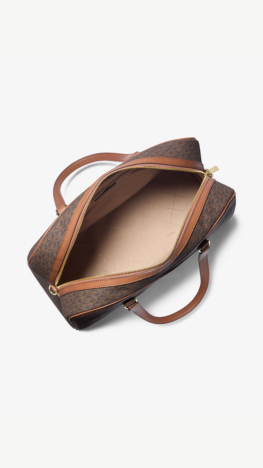 El estampado signature con el monograma MK y los detalles en cuero elevan su estética, convirtiéndolo en un bolso de viaje elegante y atemporal.